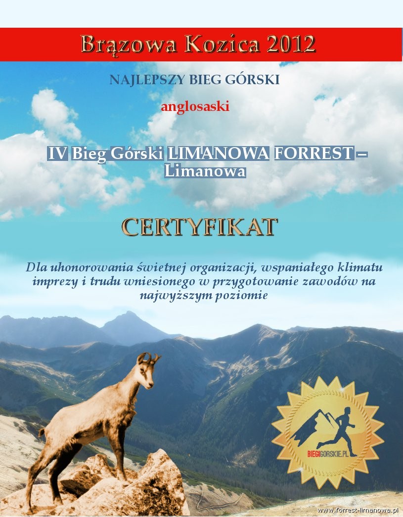 - Certyfikat "Najlepszy bieg górski - BRĄZOWA KOZICA 2012" (od "Biegów Górskich").