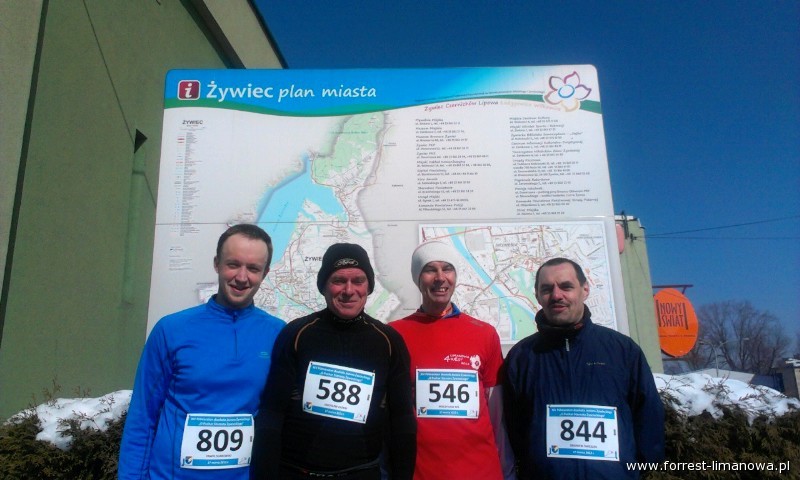 Chociaż kiedy wstałem rano i rzuciłem zaspanym okiem na termometr, to przed oczami stanął mi widok jak zamieniam się podczas biegu w mrożonkę, bo na termometrze przynajmniej u mnie było -24 C. Ale trzeba być twardym nie miękkim jak przystało na rasowego biegacza . Żywiec przywitał mnie i moich kolegów piękną i słoneczną pogodą i tylko 12 stopniowym mrozem. Samo miasto zwłaszcza Rynek (gdzie się znajdowały: Start, Meta i biuro Zawodów) jest całkiem ładne i ma swój austro-węgierski urok.